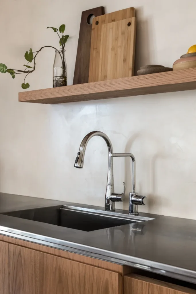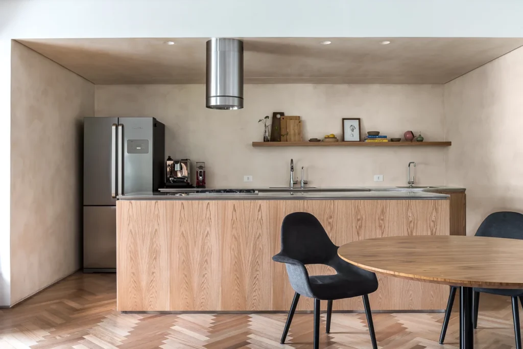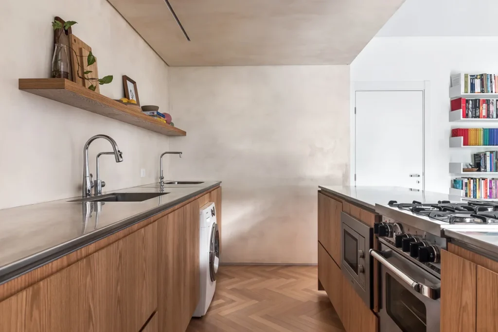 Desde o início, a colaboração com o cliente foi marcada por diálogo aberto e clareza de expectativas. Cada decisão, do dimensionamento das bancadas ao encaixe do cooktop, foi discutida em conjunto, garantindo que a funcionalidade e a estética caminhassem lado a lado. O equilíbrio visual foi reforçado pelo uso de madeira clara, contrastando com a precisão e a presença do aço inoxidável.